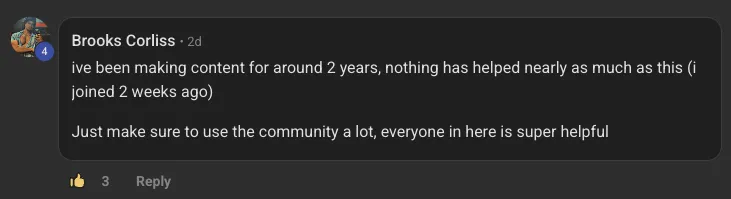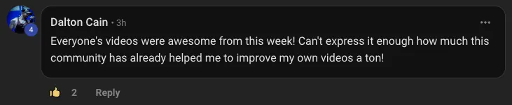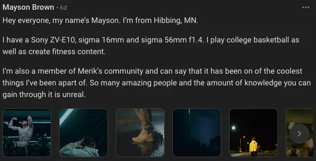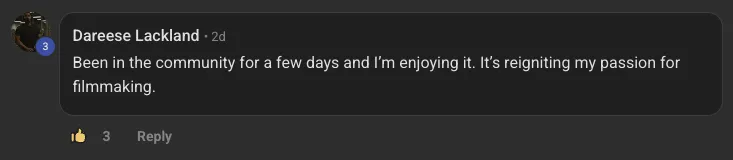 “This is the best cinematography community out there, it feels like one big friendgroup that is willing to help each other in what ever way you can ask all your questions and get them answered the same day. A lot of different courses that provide insane value. Also there are huge giveaways. And there are many chances to be able to provide value to the others in the community like myself I made a course which is now available to everyone.”